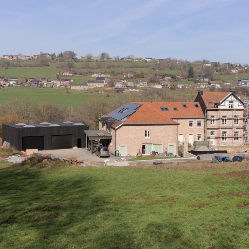 Destiné à terme à un usage privé, ce garage aux dimensions importantes est réalisé tôt dans le projet de manière à servir de stockage durant le chantier.
