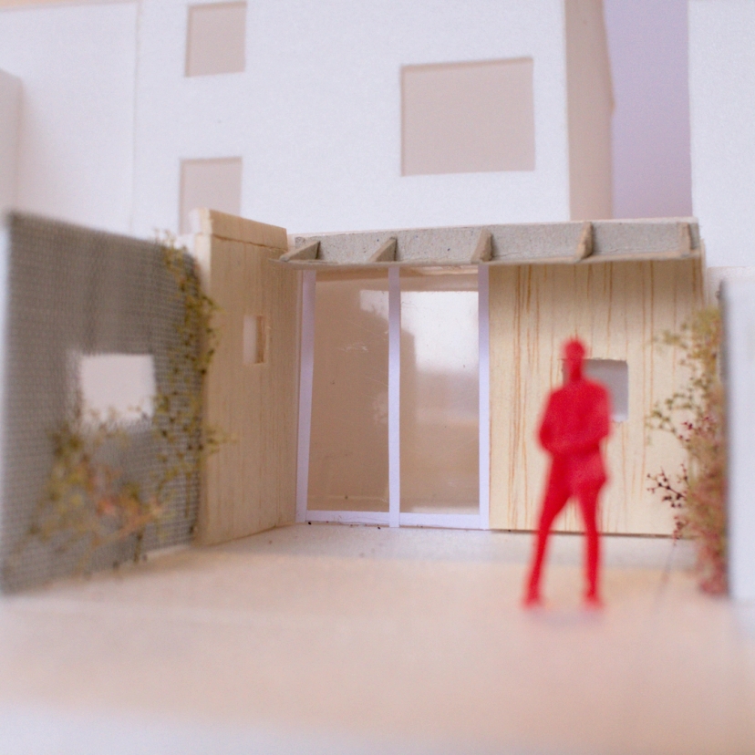 L'ensemble de l'ouvrage se présente comme un prolongement spontané de l'ancienne extension. C'est un volume existant expansé plutôt qu'un nouveau bloc dans le patchwork des volumes et des matières qui caractérisent les jardins de l'îlot. Les deux façades ainsi créées sont traitées avec un bardage bois vertical ajouré qui met en valeur ce mouvement d'expansion.